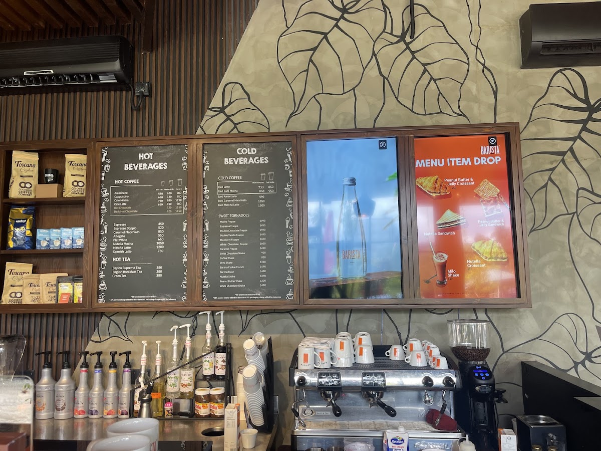 The menu at Barista Kurunegala 2 (Dambulla Road) features a selection typical of a cafe setting, focusing primarily on coffee and light food options. Visitors can expect a variety of coffee beverages including espresso-based drinks such as Americano and cappuccino. Additionally, the menu includes cold beverages like smoothies and chocolate milk topped with whipped cream.